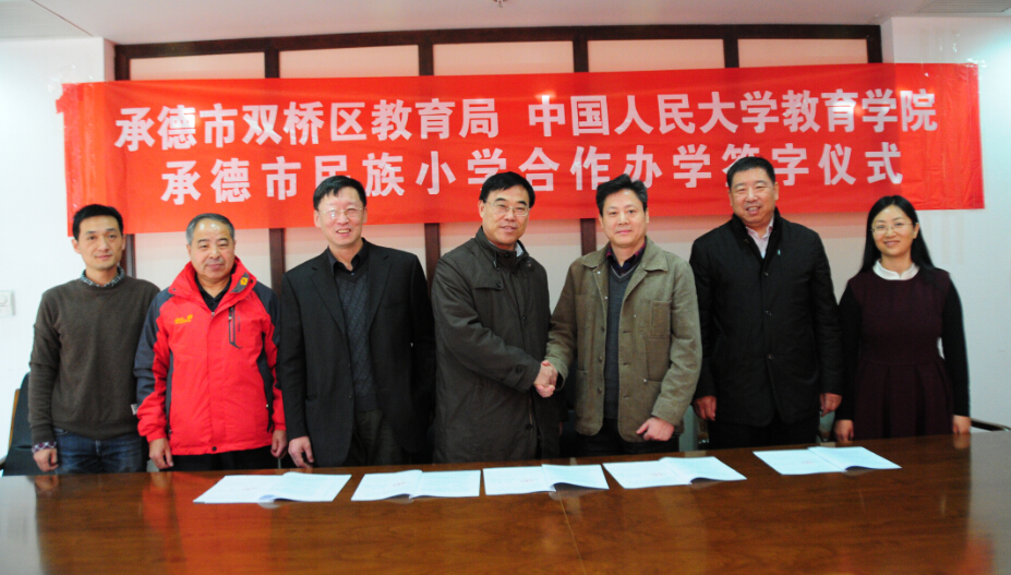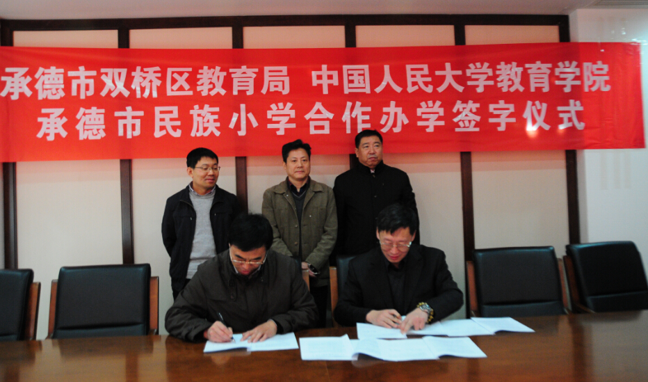 承德市双桥区教育局局长任文田和我院项目负责人程方平教授代表学院及该项目的研究团队在合作协议上签字。承德市教育局原局长、现任承德市教育督学白云生,承德市教育局办公室主任袁君,我院院长秦惠民教授、副院长李立国教授以及杨海燕副教授、严平副教授等出席了签约仪式。