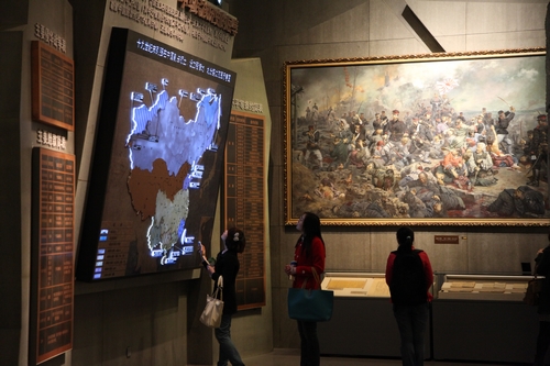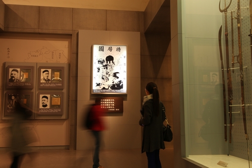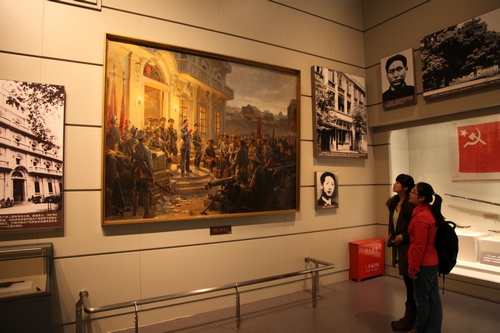 当看到南昌起义巨幅油画时,几位同学开始相互回忆在历史课本上学到的革命战争知识。