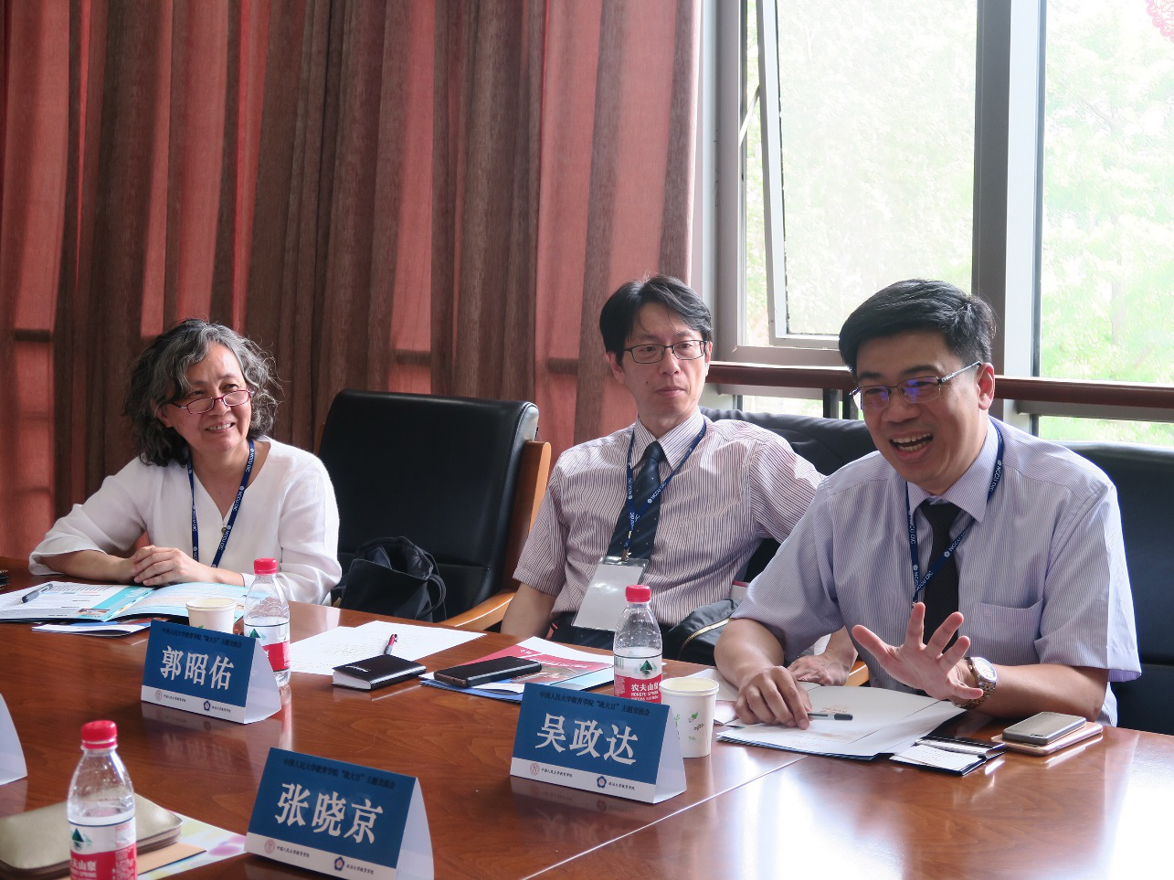 在初步了解的基础上,双方就可能开展的合作领域、共同感兴趣的研究方向展开座谈。我院程方平教授、罗云副教授、张伟副教授和崔盛助理教授先后发言,交流了自己与台湾地区既有的和即将开展的合作。政治大学张奕华教授和郭昭佑教授也提出了利用两院院办期刊合作发文投稿的设想。经讨论,双方在硕士生交换、博士生联合培养、合办会议、教育政策领域的合作研究等方面有充分的合作基础。此外,我校已有的“种子基金”模式,政大与韩国高丽大学、日本东北大学、南京师范大学创设的亚洲教育领导课程模式可以成为未来两院拓展合作的方向。