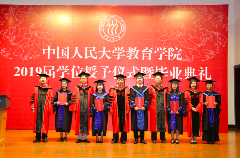 决定宣读完毕,2019届硕士学位获得者在工作人员的引导下,依次有序上台,校学位委员会副主席吴晓球教授,我院学术委员会主席程方平教授,申素平教授,李立国教授,周光礼教授共同为硕士学位获得者逐一拨穗、颁授学位证书,并与其合影留念。