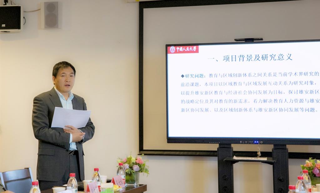 副院长周光礼教授从五个方面进行了课题开题报告,介绍了课题重点探讨的五个子课题分别为:京津冀区域经济特征与雄安新区战略定位研究,教育与区域协同发展的概念框架、理论模型与国际经验研究,教育人力资本与京津冀城市群经济社会协同发展研究,知识创新体系与京津冀城市群经济社会协同发展研究,雄安新区教育与经济社会协同发展的实现路径与策略研究。