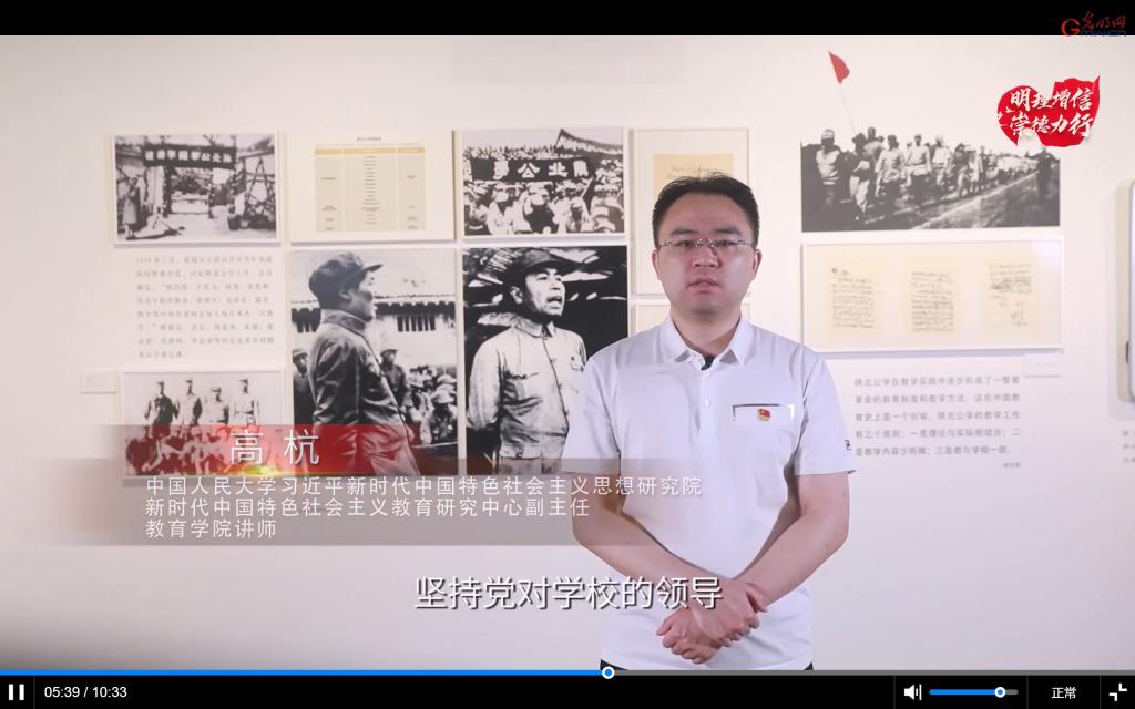 高杭在微党课中表示,陕北公学的教育理念、育人方法和领导体制都是具有开创性的。首先,坚持党对学校的领导,突出革命的政治教育。陕北公学成立之初,中共陕北公学党团也在同月成立,成仿吾任党团书记。在中共中央宣传部和组织部的领导下,作为学校最高领导机构讨论并决定学校的重大问题。在“七分政治、三分军事”的原则指导下,突出革命的政治教育是陕北公学的一大办学特色。第二,建立起一支富有斗争经验、理论和实践紧密结合的师资队伍。当时的陕北公学可谓“藏龙卧虎”“大师云集”,不仅有诸如“延安五老”之一的吴玉章、“长征路上唯一的大学教授”成仿吾、始终站在理论研究最前沿的何干之、被毛主席称为“全国第一流的法律学家”的何思敬、最早使马克思主义哲学大众化的艾思奇等知名学者和文化名人,也包括邵式平、周纯全等十几位参加过长征的工农干部,还包括陈昌浩、王若飞在内的一批党的高级领导干部,帮助学员及时掌握阶级斗争和民族斗争的脉搏。第三,开创理论联系实际的教学新模式。将每星期三规定为救亡日,发动学生走出学校到地方政府和民众组织中去做政权工作、统一战线工作、群众工作和生产劳动工作,把教育与劳动结合起来,锤炼革命意志,培养斗争精神,转变工作作风。