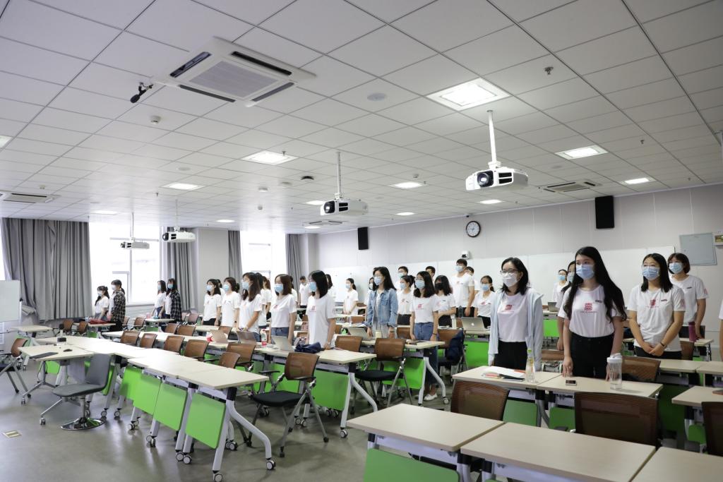 2021级新生统一身着院服、佩戴校徽,在公教一楼1604分会场集中观看。此次开学典礼仪式由黑料