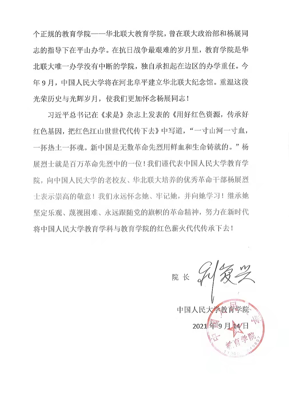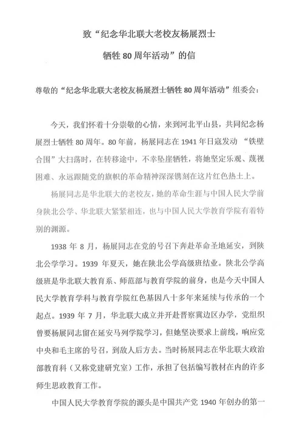致“纪念华北联大老校友杨展烈士牺牲80周年活动”的信