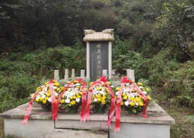 杨展烈士墓建于河北省石家庄市平山县宅北乡主投沟村的大山深处。14日上午,各单位代表徒步上山,瞻仰杨展烈士墓碑,我院程方平教授代表学院向烈士献花篮。