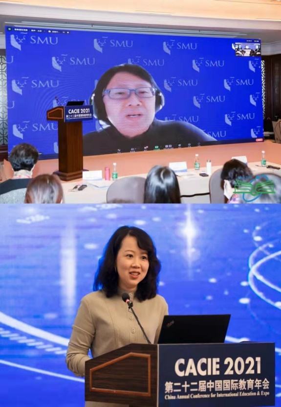 郑宝莲以“给机构赋能——促进大学生心理健康的可持续路径”为题,从自身观察与管理经验出发,以新加坡管理大学为例,分别谈及了本科生与研究生心理韧性建设的阻碍因素及其与学生良好表现之间的重要关系。通过引入新加坡管理大学新型框架,她以生动的金字塔比喻和鲜活的真实案例,展示了学校如何增强学生的心理韧性。