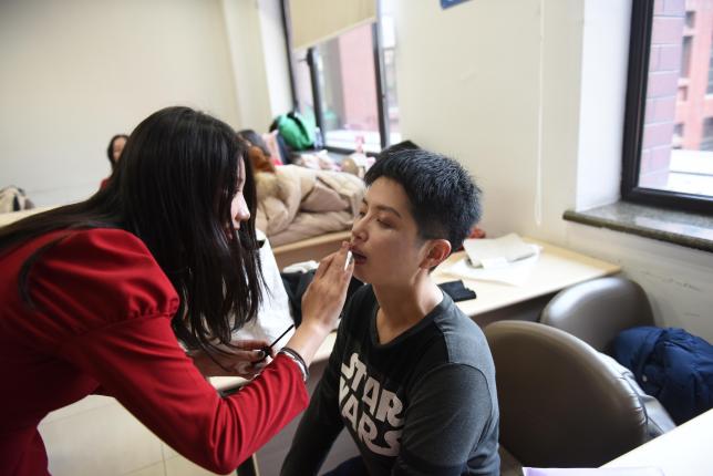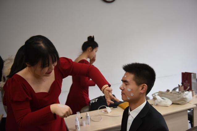 参赛师生在明德国际楼307教室备场,女生一袭红裙明艳动人,男生一身西装英姿飒爽,妆容要精致、衣着要整齐,比赛在即,参赛选手们积极筹备、紧张有序。