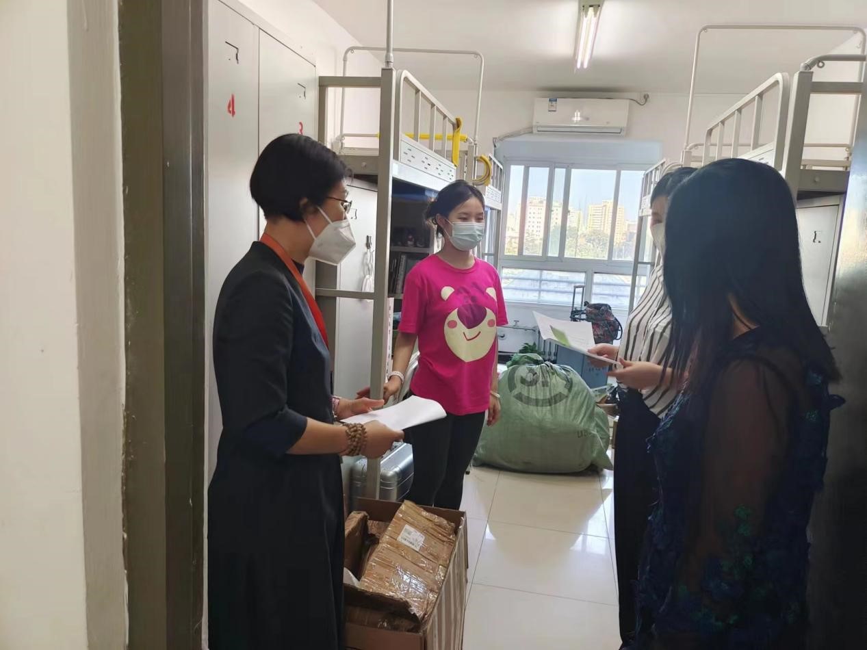 张晓京、申素平、胡莉芳、孙铭、罗云、袁玉芝走进知行楼群、国际交流中心的新生女生宿舍,对新生住宿情况进行了解。张晓京嘱咐新生务必遵守防疫要求,面对波动的疫情形势和新生初入校的适应问题,共度难关;最近处于换季期,感冒、鼻炎等多发,新生在疫情监测期结束后可以多参与体育锻炼,预防疾病,强身健体。老师们还介绍了学院和班级未来几天的迎新工作安排和活动,为新生适应校园生活营造良好环境、建立有效渠道。