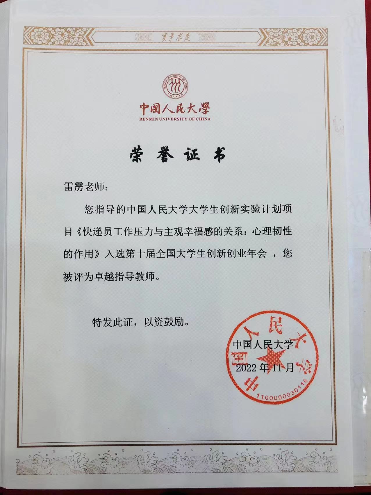 生创新实验计划项目《快递员工作压力与主观幸福感的关系:心理韧性的作用》入选第十届全国大学生创新创业年会,在本次“大创计划”十五周年总结表彰中,雷雳教授获评“卓越指导教师”称号。