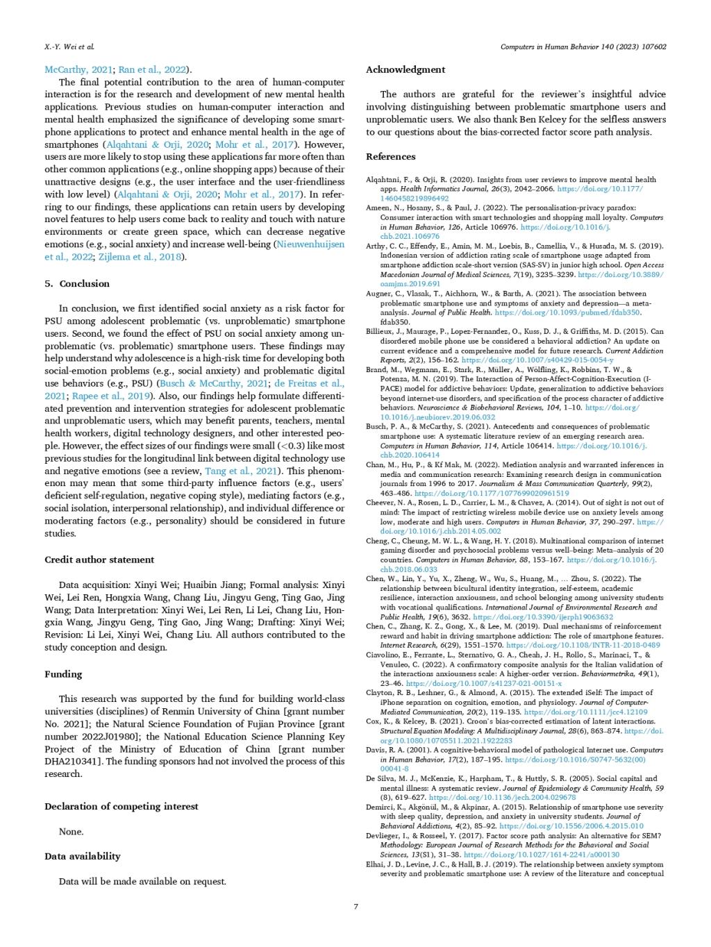 ABSTRACT:Smartphone provides diverse indirect communication channels for users, which may attract people with social anxiety. Due to the high risk of developing social anxiety and problematic smartphone use (PSU) in adolescence,it is important to investigate whether social anxiety will trigger PSU or vice versa among this group in the smartphone era. Also, most previous PSU studies include amounts of unproblematic smartphone users in the analyses, which may“muddy the waters.”Participants were 582 adolescent smartphone users (including 201 problematic users) who completed the investigation at time 1 (T1) and time 2 (T2). A bias-corrected factor score path analysis (BCFSPA) was adopted to estimate data with small or moderate sample size. BCFSPA showed that social anxiety at T1 positively predicted PSU at T2 among problematic (vs. unproblematic) smartphone users.Also, PSU at T1 positively predicted social anxiety at T2 among unproblematic (vs. problematic) smartphone users. Our results have identified social anxiety as a risk factor for PSU among adolescent problematic (vs. unproblematic) smartphone users; the compensatory Internet use model combined with the habit theory of addiction can explain this finding. Besides, the dilution effect hypothesis can explain the effect of PSU on social anxiety among unproblematic (vs. problematic) smartphone users.