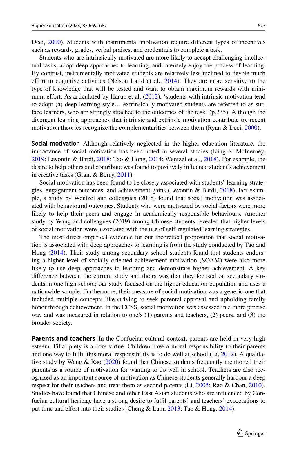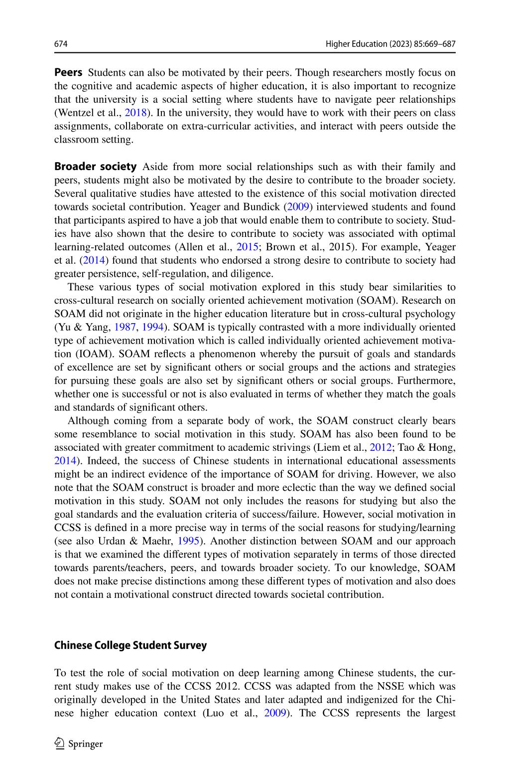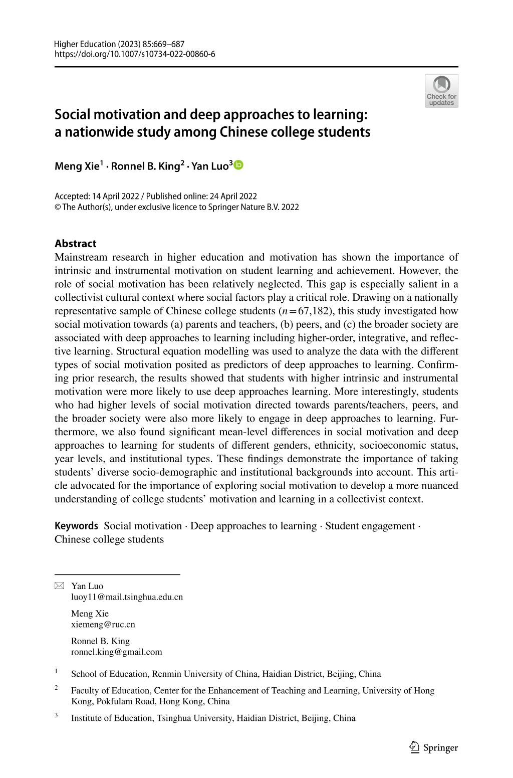 Keywords:Social motivation Deep approaches to learning Student engagement Chinese college students