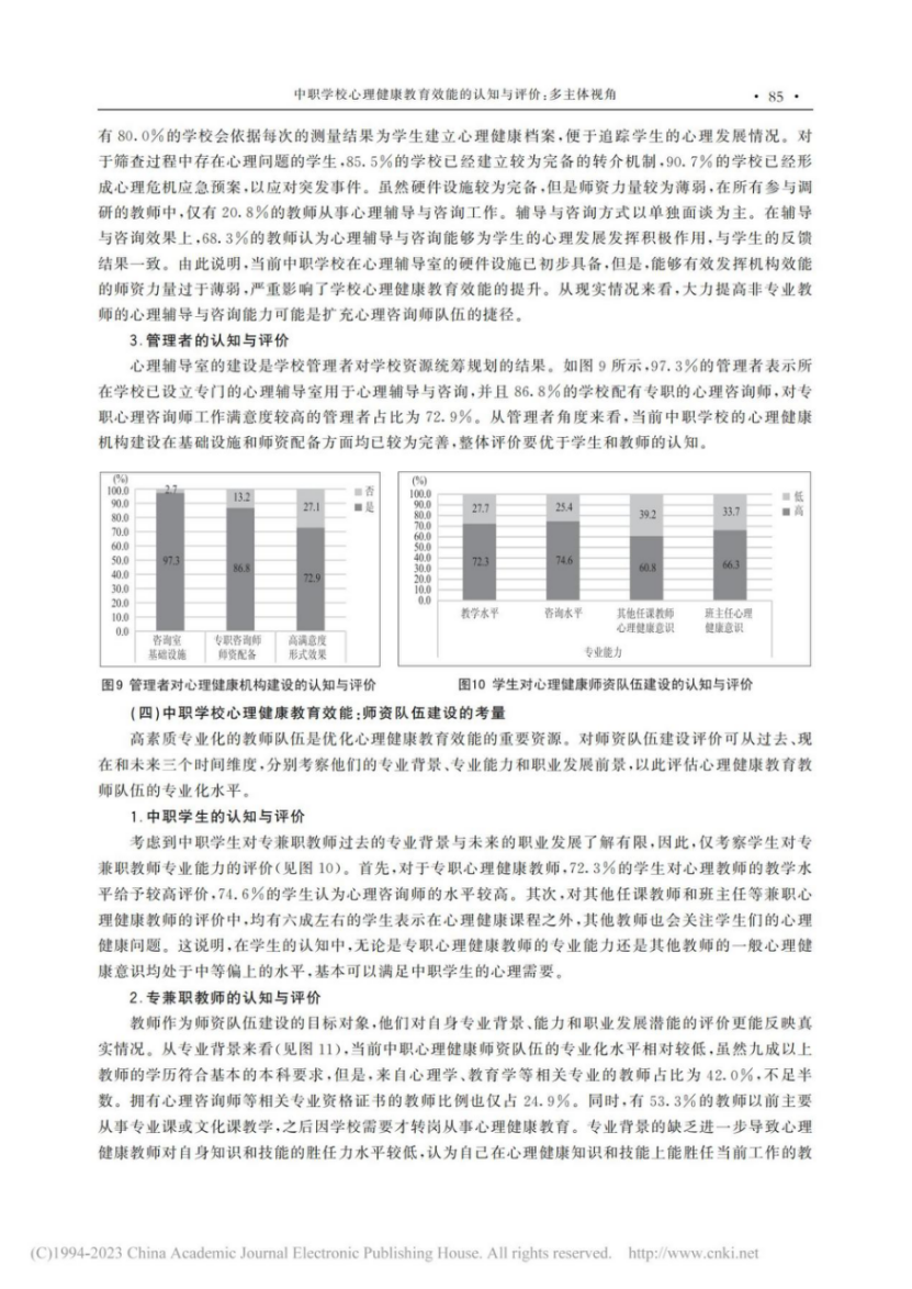 [摘 要]为全方位了解中职学校心理健康教育效能的发展现状,我们对全国20个省市的82所中职学校的62632名中职学生、1714名专兼职教师和439名管理者进行了问卷调查,比较了学生、教师和管理者三个主体在制度建设、课程建设、机构建设和师资队伍建设四大要素上对心理健康教育效能的认知与评价。结果发现:(1)在制度建设上,管理者的评价明显优于学生和教师,但三个主体均认为心理健康制度建设的水平较低;(2)在课程建设上,表示学校已开设心理健康课程的学生和教师比例均低于管理者约二成,对教学形式多样性评价较高的教师占比为44.2%,管理者占比为96.4%;(3)在机构建设上,三个主体的评价基本一致,认为学校设置心理咨询室等基础设施的主体比例约为八至九成,认为心理辅导与咨询效果良好的占比为七成左右;(4)在师资队伍建设上,约有七成左右的学生和管理者对心理健康教师的专业能力给予较高评价,明显高于教师的自我评价,但心理健康教师的晋升机会在教师和管理者的评价中均处于最低位。由此说明,不同主体对学校心理健康教育效能的评价存在出入,分析主体间的认知差异将有助于发现问题,提升效能。未来中职学校心理健康教育工作应大力促进不同主体与要素间的最优配合,突出管理者在制度建设上的领导力优势,积极听取学生和教师的需求与建议;促进学生与教师在课程教学中的相互协作,学生善学,教师善教;深化心理健康机构的内在目标,追求教育效果提升而非硬件基础设备;鼓励教师把握培训机会,关注自身专业成长,内外兼修。